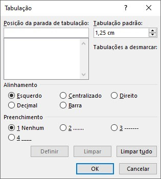 Em Preenchimento: Escolha qual será o preenchimento desse espaço da tabulação, ou seja do 0 (zero) até 1 centímetro.
